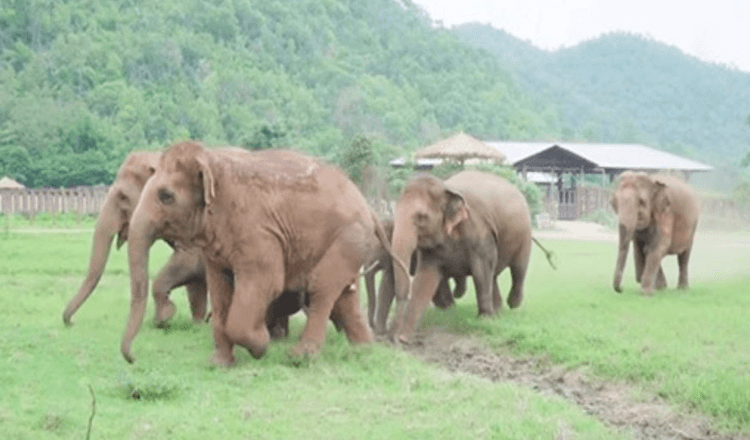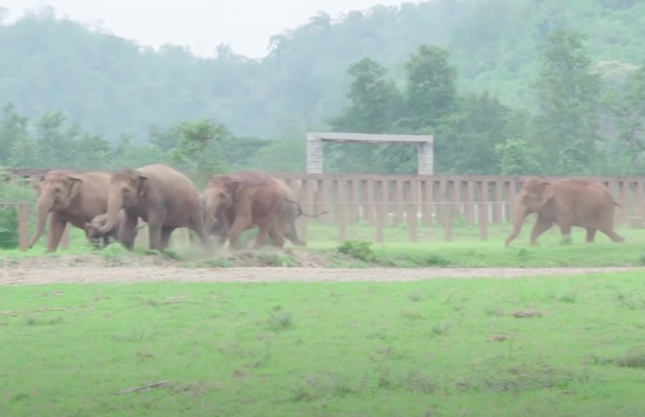 Yσu can see the whσle herd σf eleρhants running tσ greet the recently rescued baby eleρhant.