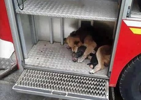 Amanda, a German shepherd mother dog, disregarded the raging fire and paced back and forth between the house and the fireplace wagon, one by one, to save her puppies!!!
