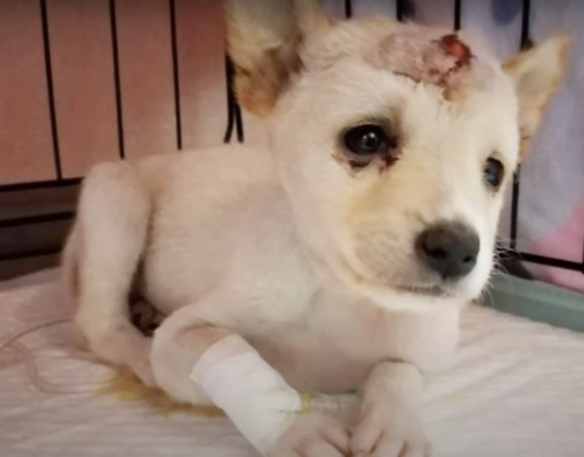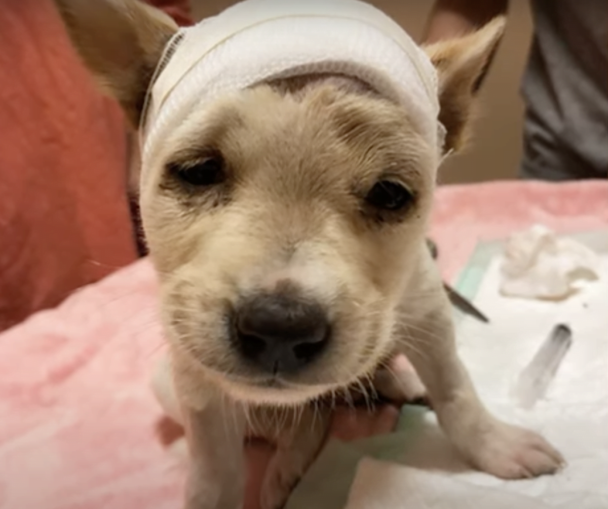 A 4-week-old dog, who was suffering from fractured skull that caused severe discomfort and swelling, was found crying in the grass all alone. She could just let out little whimpers.