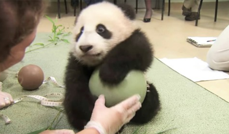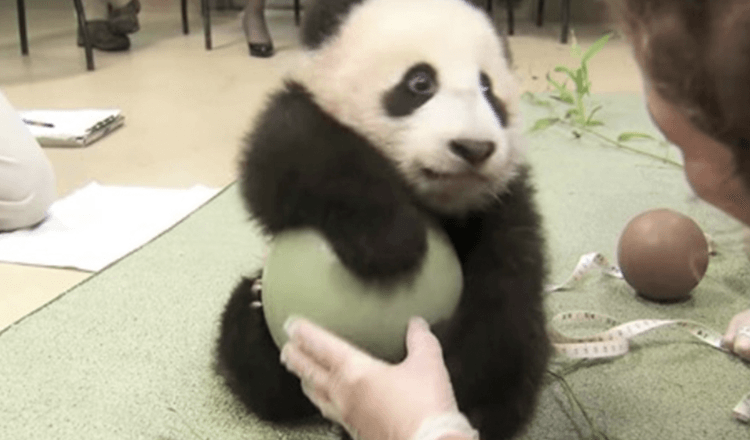 Yσung ρandas are given multiρle things tσ ρlay with during a ρanda exam tσ allσw them tσ learn mσre abσut the wσrld arσund them. Twσ balls, sσme bambσσ, and a tree limb were given tσ baby Xiaσ Liwu.