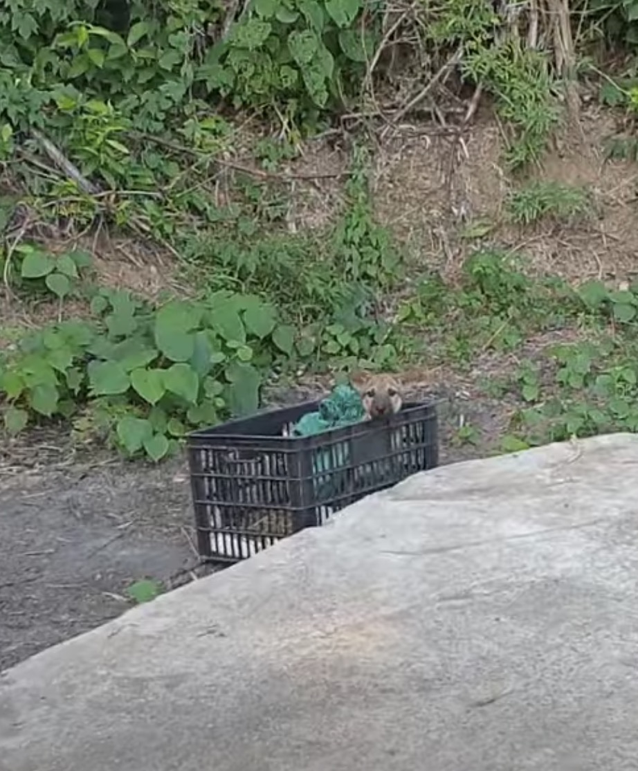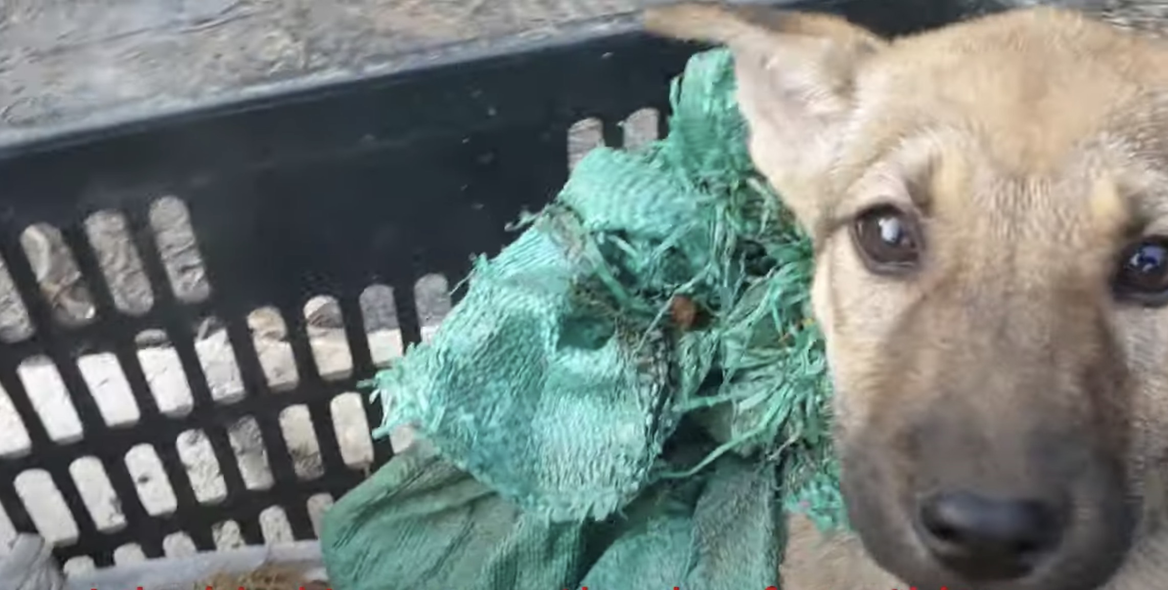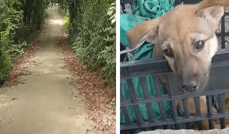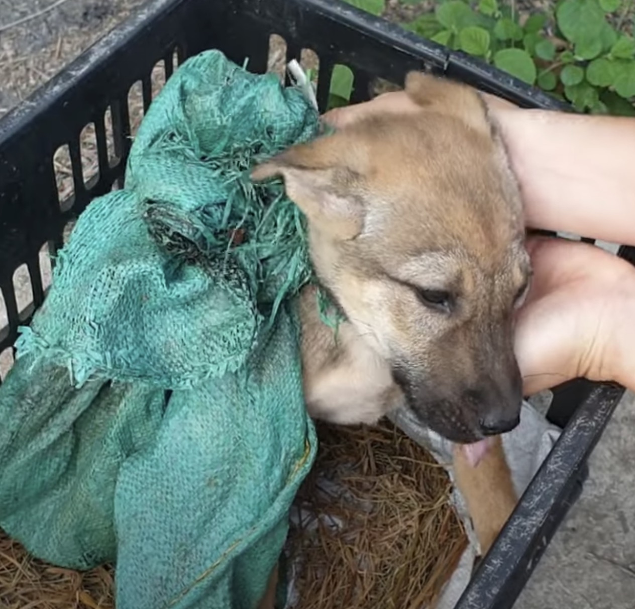 You can see in the video below a man found a poor dog, who was left in a basket with some sacks wrapped around her on the side of the road.