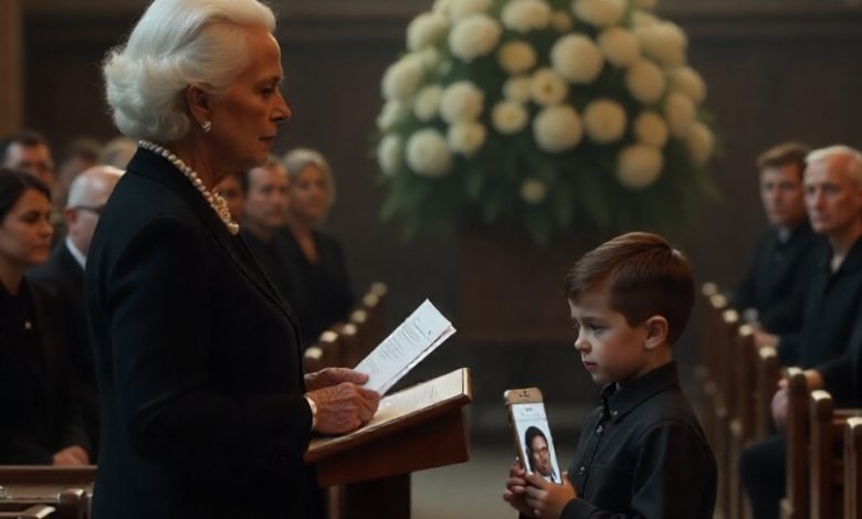 At my husband’s memorial, his mother raised her chin and said coldly, “At least he isn’t here anymore to face her shame.” Around the chapel, relatives nodded in silent agreement. Then something happened that no one expected. My 8-year-old son stood up, clutching his dad’s phone tightly. His voice rang out, “Grandma, should I show everyone what Dad recorded about you last week?”