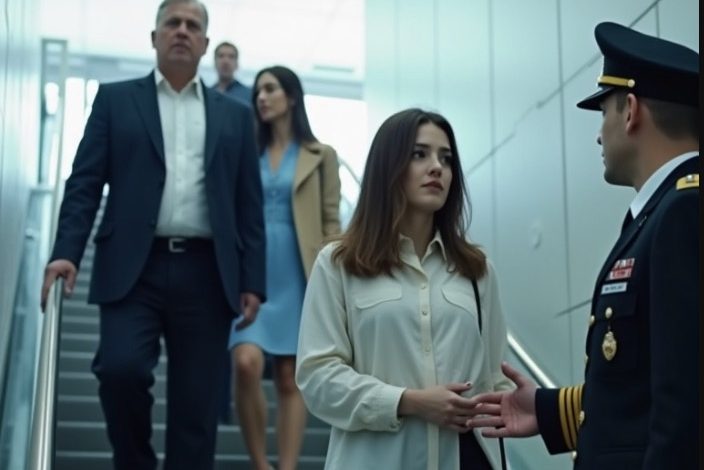 A few minutes passed. Travelers rushed around me. Children cried. Suitcases rolled. Then, the noise seemed to fade. I saw a tall man in a navy-blue uniform walking straight toward me. He stopped and spoke with a firm, respectful tone.
