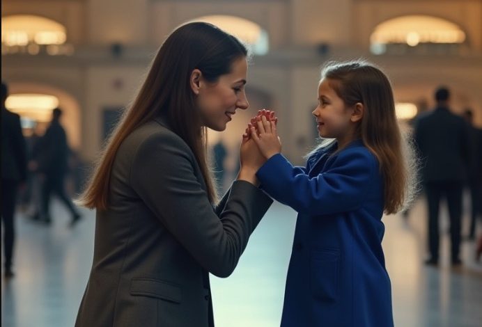 A little girl stood before her — no older than eight. She wore a dark blue coat buttoned neatly to the top and shiny red rain boots that stood out against the gray floor. Her light hair was tied into two neat braids, and she held a small backpack with a cartoon fox on it.
