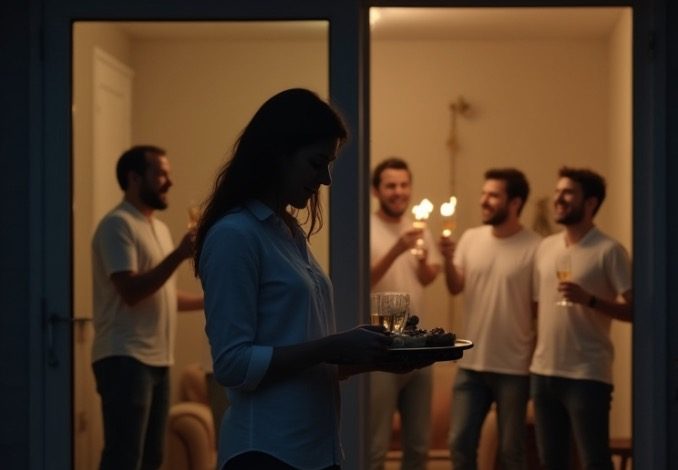 I set the tray down gently, even though my heart was pounding in my chest. They hadn’t noticed me yet. For half a minute, I just stood there, watching them celebrate his words. My husband—my partner of twelve years—looked proud, smiling as his friends encouraged him to talk more.
