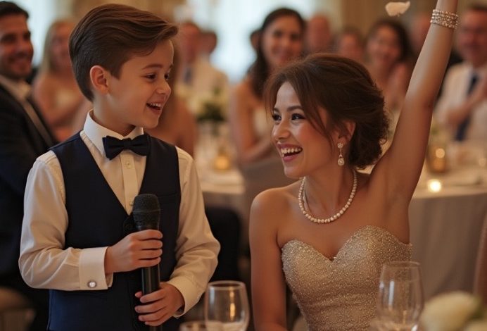 The room burst into laughter. My hands shook under the table as I forced a polite smile. But the laughter ended the moment my nine-year-old son, Noah, stood up, walked straight to the microphone, and said, “I know something about the bride.”