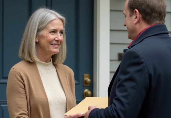 I took my time. I smoothed my pants, walked to the door, and saw exactly what I expected. Steven stood frozen, face pale. Paul Matthews stood on the porch. He didn’t look like a doddering old man; he looked like someone used to being in charge—fit, silver hair, sharp suit. Beside him was Max, straining at the leash, tail going wild when he saw me. Two serious-looking men in dark suits stood on either side, badges clipped to their belts.