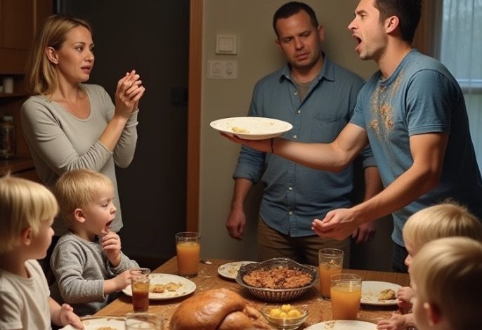 Her eyes went wide, and her jaw set. Then, in one fast motion, she grabbed her plate and flung it at me. Gravy and stuffing hit the wall with a wet slap.