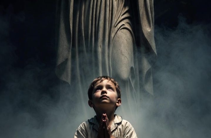 The first time I noticed anything unusual was on a Sunday morning, three weeks after he arrived. I was washing dishes and glanced outside. Ethan wasn’t playing with his toys. He was standing in front of the statue with his hands resting on the stone ledge, staring up at Mary with a quiet reverence.