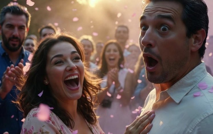 The balloon burst open with a loud crack, and pink confetti swirled through the air like a soft storm. Emma cried instantly—real, joyful sobs. She clung to Greg as though she were holding the future itself.