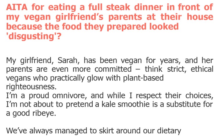"AITA for eating a full steak dinner in front of my vegan girlfriend’s parents at their house because the food they prepared looked 'disgusting'?"
