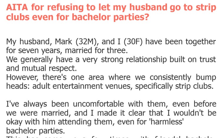 "AITA for refusing to let my husband go to strip clubs even for bachelor parties?"