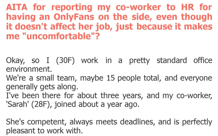 "AITA for reporting my co-worker to HR for having an OnlyFans on the side, even though it doesn't affect her job, just because it makes me "uncomfortable"?"