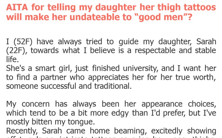 "AITA for telling my daughter her thigh tattoos will make her undateable to “good men”?"
