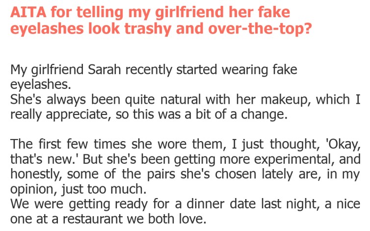 "AITA for telling my girlfriend her fake eyelashes look trashy and over-the-top?"