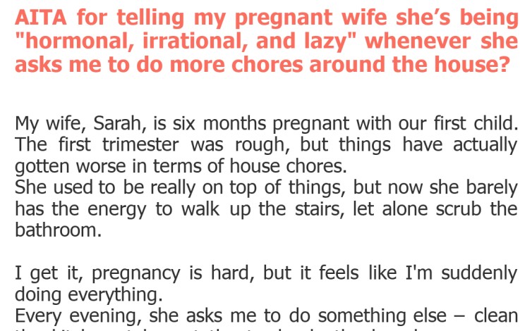AITA for telling my pregnant wife she’s being “hormonal, irrational, and lazy” whenever she asks me to do more chores around the house?