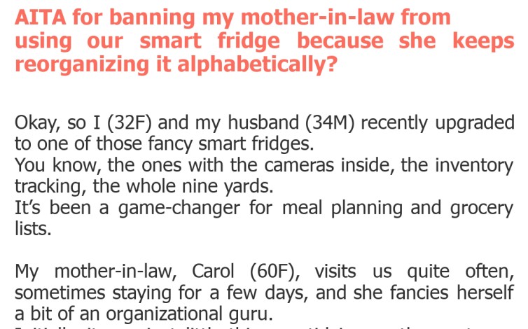 "AITA for banning my mother-in-law from using our smart fridge because she keeps reorganizing it alphabetically?"
