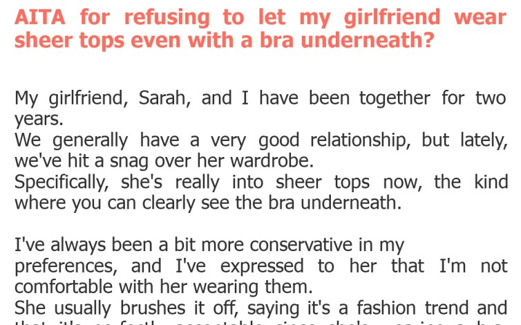 "AITA for refusing to let my girlfriend wear sheer tops even with a bra underneath?"