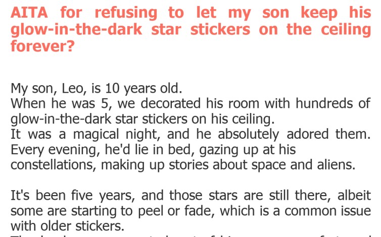 "AITA for refusing to let my son keep his glow-in-the-dark star stickers on the ceiling forever?"