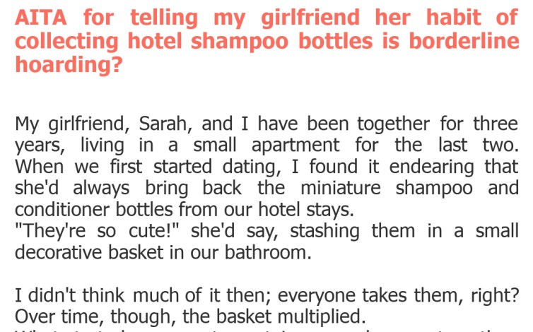 "AITA for telling my girlfriend her habit of collecting hotel shampoo bottles is borderline hoarding?"