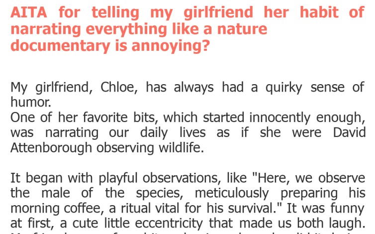 Our original poster (OP) brings us a tale that sounds straight out of a sitcom, yet carries the very real weight of relationship friction. His girlfriend has a rather distinctive way of interacting with the world: by narrating everything around them in the dramatic style of a nature documentary. While initially charming or amusing, this constant commentary has now pushed OP to his breaking point. Was he justified in finally telling her it's annoying?