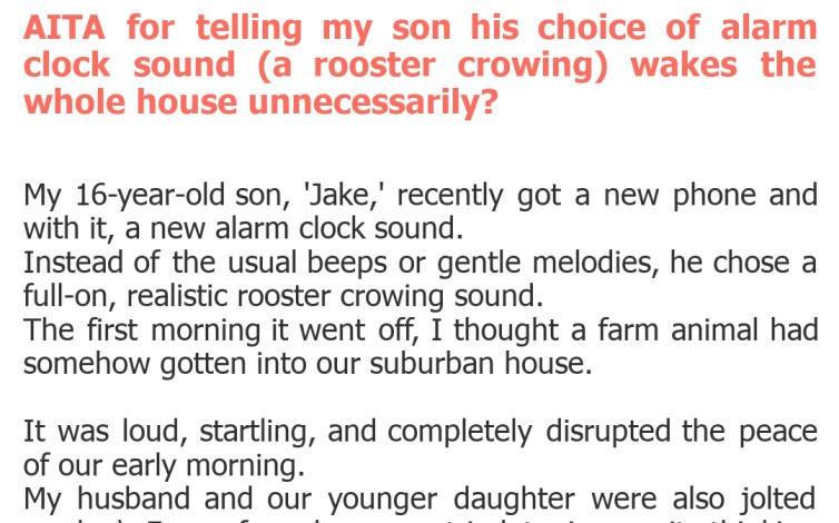 Welcome back, dear readers, to another edition of 'Am I the A**hole?' where we dissect family dramas and societal squabbles. Today's tale pecks at a very common household annoyance: the alarm clock. We've all been there, right? That jarring sound that pulls you from slumber, but what happens when it's not just *your* alarm, but someone else's, disturbing the entire household? Let's crow about it.\nThis week, we have a parent struggling with their son's peculiar choice of wake-up call. It's a classic case of personal preference versus communal peace, where one person's effective morning routine becomes another's early-morning torment. Is our OP justified in wanting a quieter start to the day, or should the son be allowed his preferred method of waking up? Let's dive into the clucking dilemma.