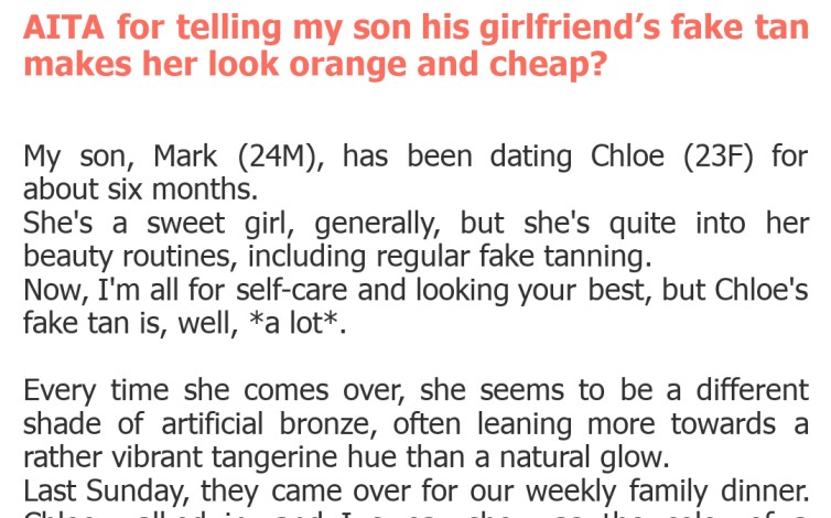 Today's AITA story brings us exactly that kind of familial tightrope walk. Our poster, a concerned mother, found herself in a situation many parents can relate to: observing something about her son's girlfriend that she felt compelled to comment on. The topic? A less-than-flattering fake tan. Was her honesty justified, or did she cross a boundary that should have remained firmly in place? Let's dive into the story and see what you think.