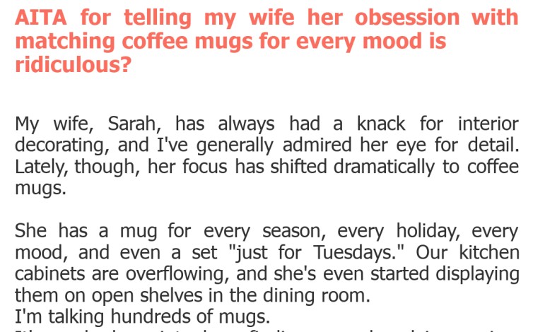 "AITA for telling my wife her obsession with matching coffee mugs for every mood is ridiculous?"