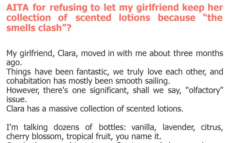 "AITA for refusing to let my girlfriend keep her collection of scented lotions because “the smells clash”?"