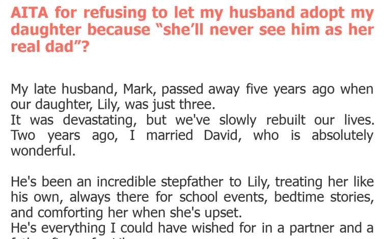 "AITA for refusing to let my husband adopt my daughter because “she’ll never see him as her real dad”?"