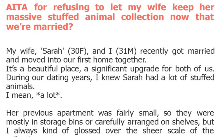 Our poster, fresh into marital bliss, is grappling with a very fluffy, very voluminous problem: his new wife's truly massive collection of stuffed animals. What might have been a quirky charming hobby before tying the knot is now, in his eyes, an insurmountable obstacle to domestic harmony. Let's dive into the plush-toy pandemonium and see if he's the one out of line.
