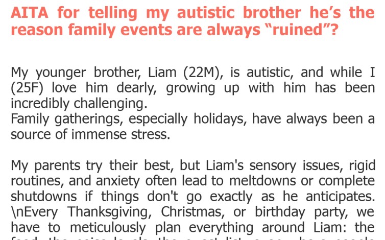 "AITA for telling my autistic brother he’s the reason family events are always “ruined”?"