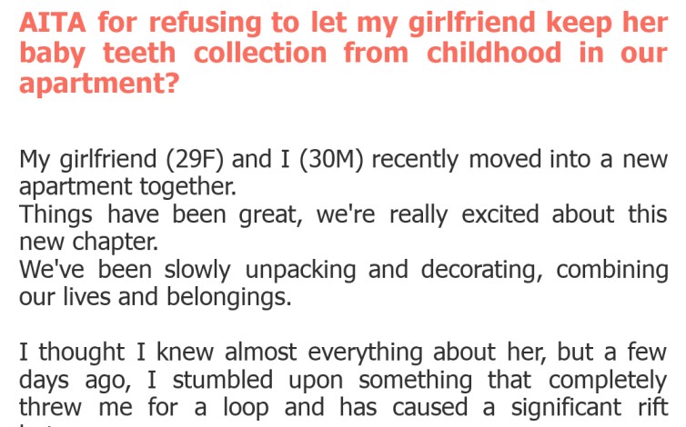 "AITA for refusing to let my girlfriend keep her baby teeth collection from childhood in our apartment?"