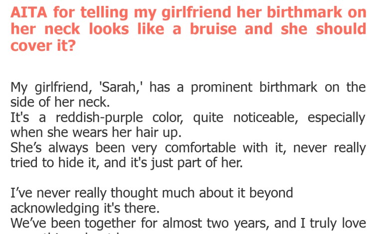 This story is a textbook example of good intentions paving the road to hurt feelings. On one hand, OP claims he was genuinely concerned about how Sarah's birthmark might be perceived by others, specifically fearing it could be mistaken for a bruise and potentially reflect poorly on him or imply domestic abuse. This protective instinct, while misguided in its execution, isn't inherently malicious. It speaks to a level of social awareness, albeit a somewhat misplaced one.
