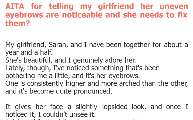 "AITA for telling my girlfriend her uneven eyebrows are noticeable and she needs to fix them?"