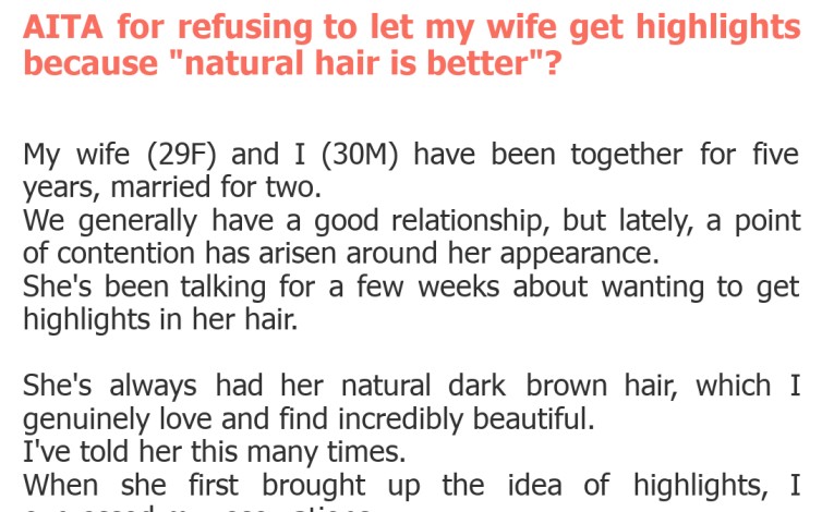 "AITA for refusing to let my wife get highlights because "natural hair is better"?"