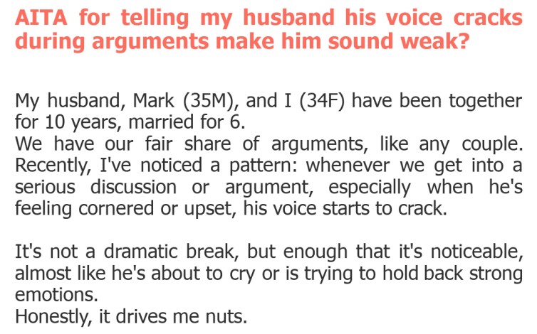 "AITA for telling my husband his voice cracks during arguments make him sound weak?"