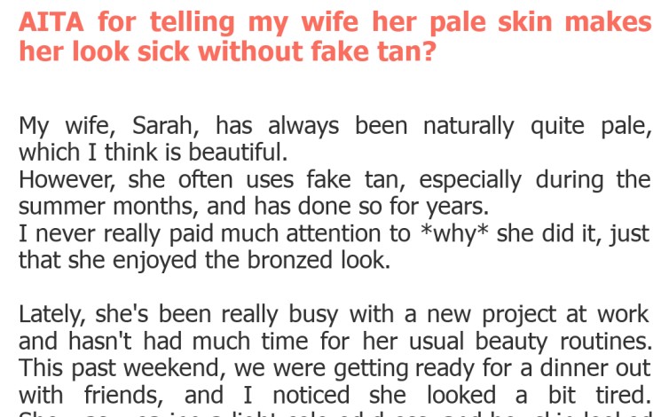 "AITA for telling my wife her pale skin makes her look sick without fake tan?"