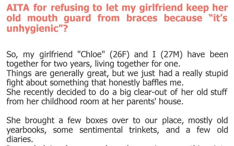 Welcome back, internet citizens, to another edition of "Am I The A**hole?" where we dive deep into the everyday dilemmas that somehow escalate into full-blown relationship crises. Today's story brings us a seemingly trivial object, yet one that has apparently caused a rift between a couple: an old mouthguard from braces. Yes, you read that right. The mundane can indeed become monumental.\nIt's astonishing how something so small can spark such a heated debate. Our original poster, let's call him "Hygiene Hero," is utterly baffled by his girlfriend's attachment to what he perceives as a biohazard. She, on the other hand, sees a relic of her past, a symbol of perseverance. Who's right, who's wrong, and is there even a right answer when sentimentality clashes with practicality? Let's find out.