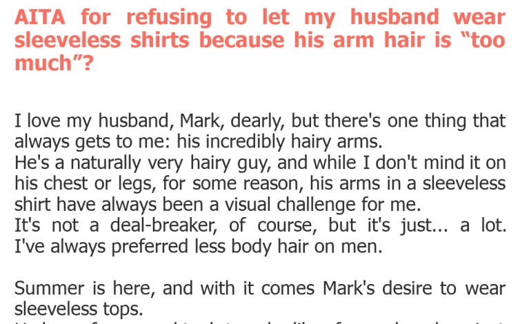 Our protagonist is questioning if she crossed a line with her husband over a very specific aesthetic concern: his arm hair. We all have things that might not be our partners' favorite, but when does a preference become a demand that impacts personal comfort and autonomy? This one truly makes you think about where the line is drawn and if it's fair to ask a partner to alter their natural appearance for you.