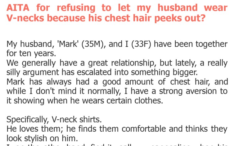 "AITA for refusing to let my husband wear V-necks because his chest hair peeks out?"