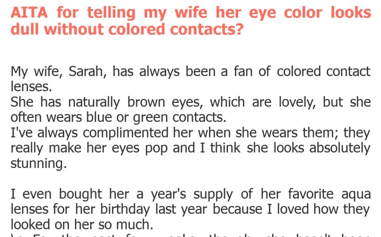 Oh, the delicate dance of compliments and critiques in a relationship! We all want our partners to feel cherished and beautiful, but sometimes, our words, even when well-intentioned, can land completely wrong. Today's AITA story is a perfect example of how a seemingly innocuous comment about appearance can ignite a full-blown marital dispute, leaving both parties feeling misunderstood and hurt. \n It's a common dilemma: is honesty always the best policy, especially when it comes to personal aesthetics? Our submitter, let's call him Mark, found himself in hot water after offering an unsolicited observation about his wife's eye color. This isn't just about contacts; it's about deeper insecurities, perceived expectations, and the impact of our casual remarks. Let's dive into the details and see if Mark is truly the A-hole.