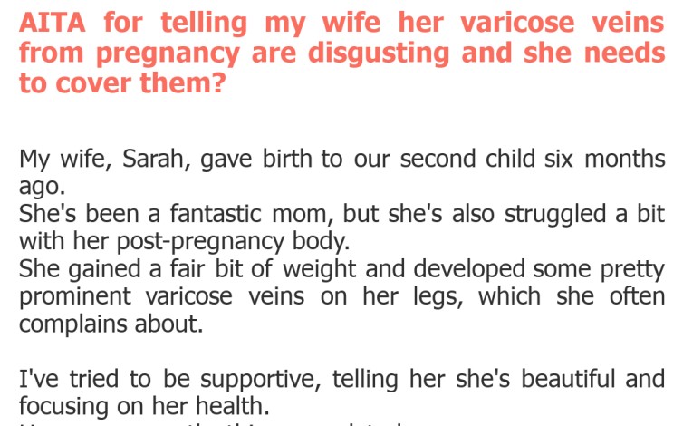 "AITA for telling my wife her varicose veins from pregnancy are disgusting and she needs to cover them?"