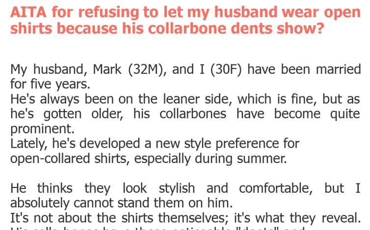 "AITA for refusing to let my husband wear open shirts because his collarbone dents show?"