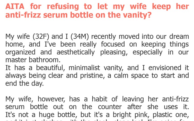 "AITA for refusing to let my wife keep her anti-frizz serum bottle on the vanity?"
