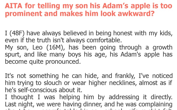 "AITA for telling my son his Adam’s apple is too prominent and makes him look awkward?"