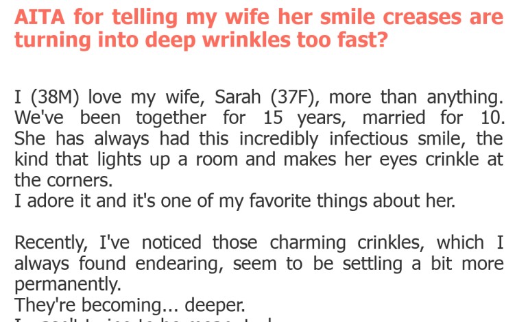 "AITA for telling my wife her smile creases are turning into deep wrinkles too fast?"