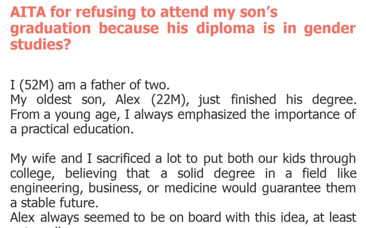 "AITA for refusing to attend my son’s graduation because his diploma is in gender studies?"
