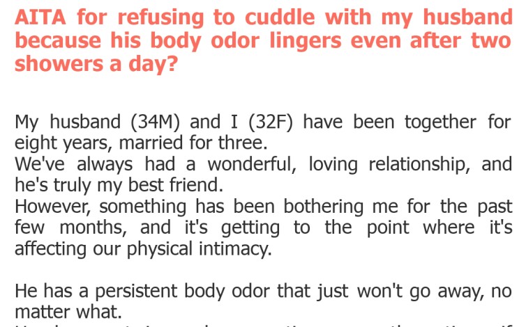 "AITA for refusing to cuddle with my husband because his body odor lingers even after two showers a day?"
