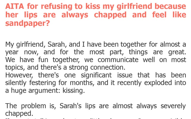This story serves as a stark reminder that even seemingly minor physical details can become major relationship hurdles if not addressed with care and clear communication. While OP's feelings about the discomfort are absolutely valid, the emotional impact on Sarah cannot be ignored. The path forward for this couple will require genuine empathy from both sides, an open dialogue about needs and feelings, and a commitment from Sarah to address the chapped lips, perhaps even consulting a doctor if it's a persistent issue. It’s a moment for growth, not just blame.